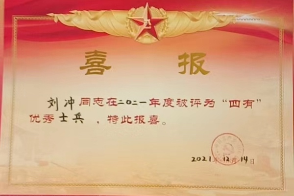 2020年春季征兵时,刘冲依然毫不犹豫地再次报名,一切都顺利通过的他回到家中等待着年后回学校复检。谁料这一等就是半年。终于,在2020年9月,他第3次报名入伍,这次终于戴上红花绶带,如愿踏进了军营。